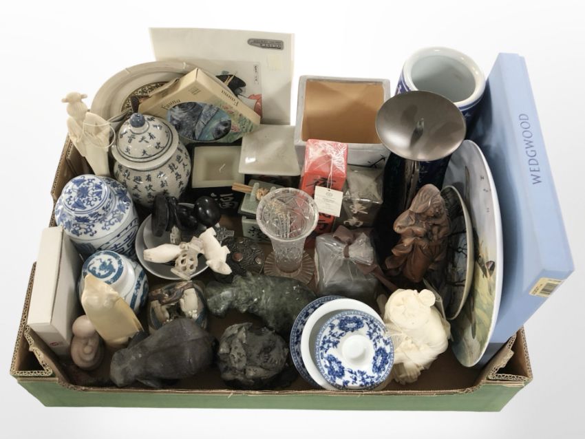 Assorted oriental porcelain ginger jars, sleeve vase, carved soapstone figure of a hippo, other ornaments, collector's plates including Wedgwood, wrought-metal candlestick and candles, etc. (1 box)