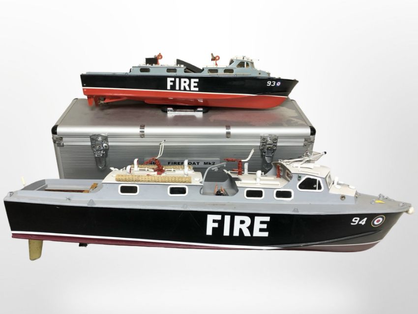 Two RAF scale model firefloat boats, largest 90cm long, one in aluminium carry case.