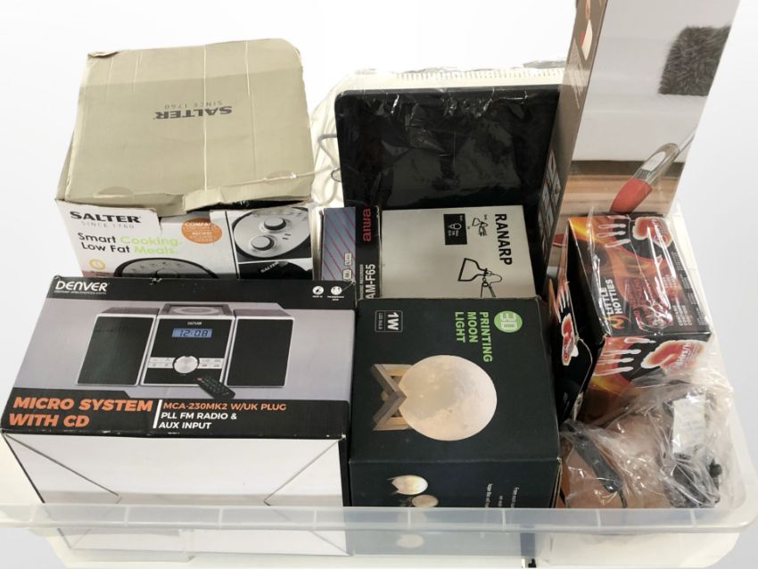 A group of home wares including Salter air fryer, Denver micro Hi-Fi system, lighting, etc. (1 box)