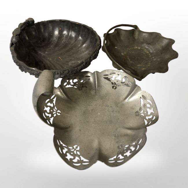 Three Arts and Crafts pewter baskets, longest 25cm.