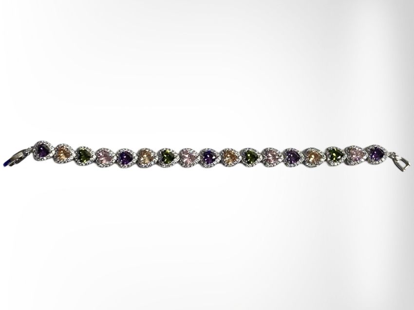 A white metal bracelet set with heart shaped multicoloured synthetic stones, length 18cm