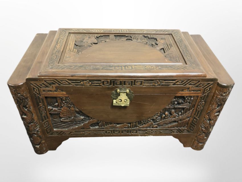 A Chinese carved camphor wood chest, 93cm w x 49cm d x 52cm h.