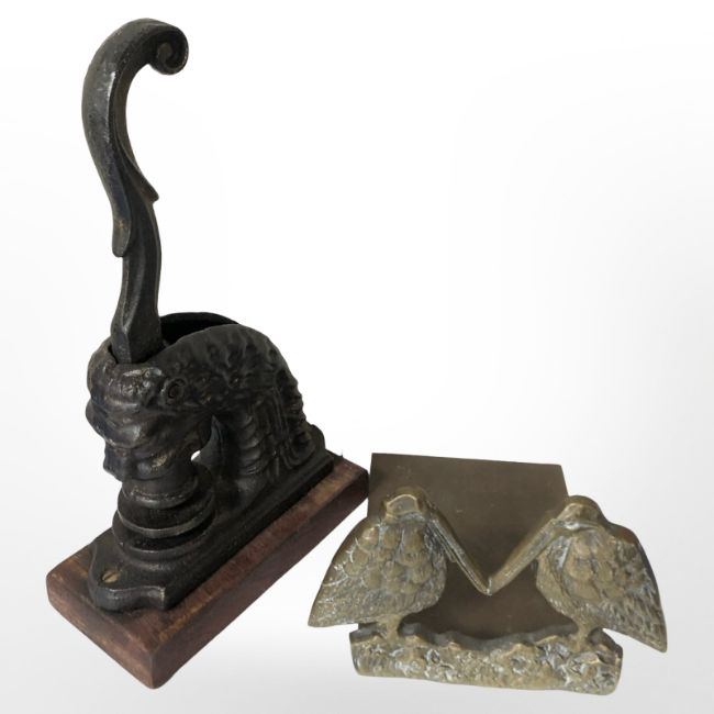 A Victorian cast iron desk stamp in the form of a lion, together with a brass bookend.
