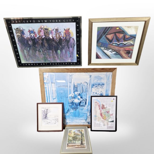 A Jannes Art Publishing Art Expo New York City print in silvered frame, 86cm by 69cm, together with a Janet Smith watercolour winter landscape, further pastel sketch signed Parry, a French wines print and two other prints (6)