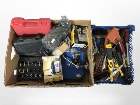 A group of hand tools, socket set, Sony and Sanyo cassette recorders in boxes, etc. (2 boxes)