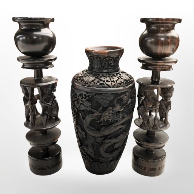 A pair of African carved hardwood figural candlesticks, height 27cm, and a modern Thai resin vase.