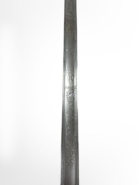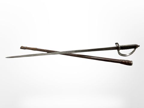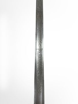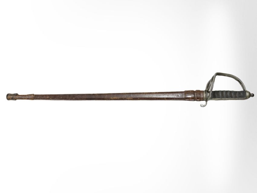 A British 1821 pattern Royal Artillery Officer's sword, 82cm engraved blade with George V cypher and Royal Artillery, steel 3-bar hilt, with leather scabbard