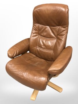 A late 20th century Danish stitched tan leather swivel armchair on bentwood support