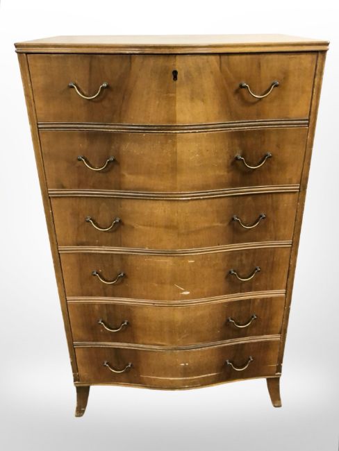 A 20th century continental walnut and pine serpentine front six drawer chest, 66cm x 45cm x 112cm.
