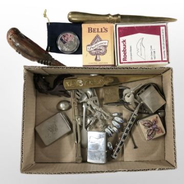 A small box of collectibles including Budweiser lighter, brass letter knives, oriental carved wooden koi fish, travelling inkwell, etc.