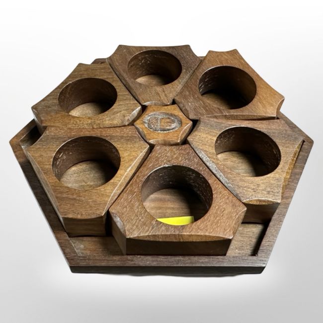 A set of six carved teak napkin rings on hexagonal stand, width 17cm.
