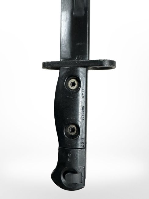A British Military bayonet L1A3 knife bayonet with scabbard, 20cm Bowie blade stamped '67 Enfield', with webbing frog