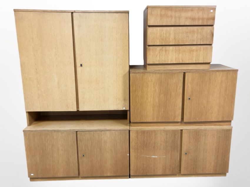 Five various Danish oak veneered cabinets, largest 100 cm x 36 cm x 109 cm