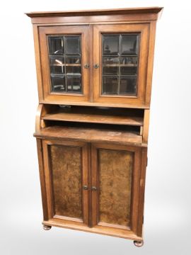 An early 20th century continental glazed walnut double door cabinet, 76cm x 54cm x 149cm.