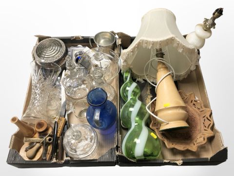 Assorted silver plated and glass wares, turned wooden table lamp, carved bowl, antique cutthroat razor, etc. (2 boxes)