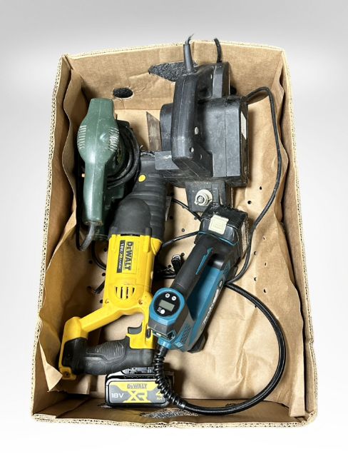 A group of power tools, to include: an electric planer, a Makita DMP 180, a DeWalt saw, with battery, and a JMB sander.