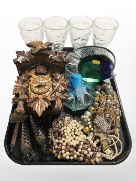 A reproduction carved cuckoo clock, a group of costume bead necklaces, glass octopus and fish paperweights, and a set of four goblets.