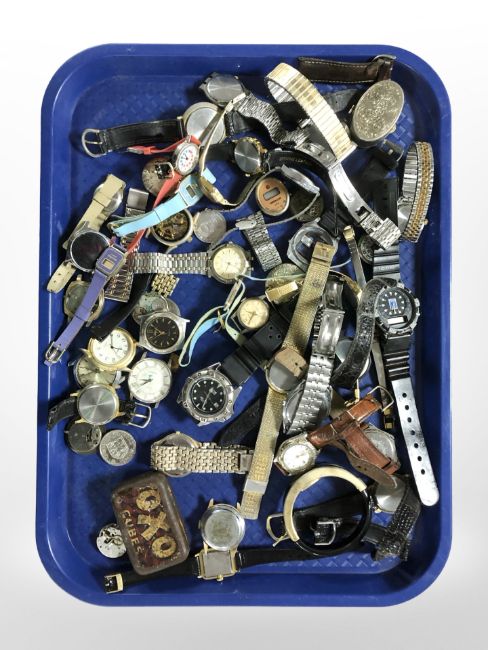 A large quantity of lady's and gent's wristwatches including Gucci, Sekonda, etc., a small pill box, vintage OXO tin.
