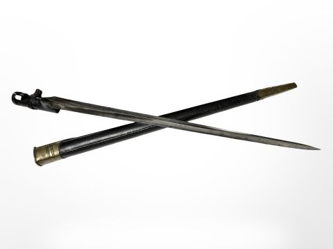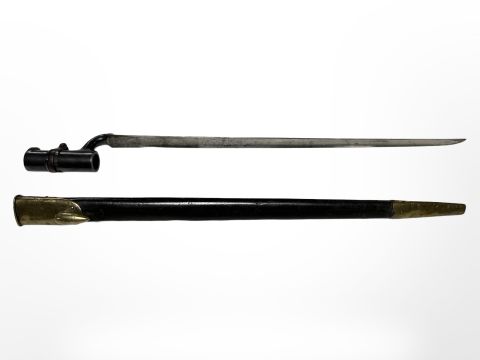 A British Pattern 1853 socket bayonet with brass-mounted WD stamped leather scabbard, blade 43cm long