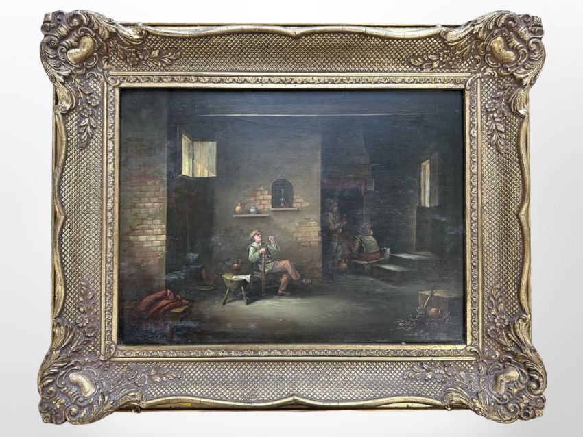 Continental school : Figures in a tavern, oil on panel, 39cm x 29cm.