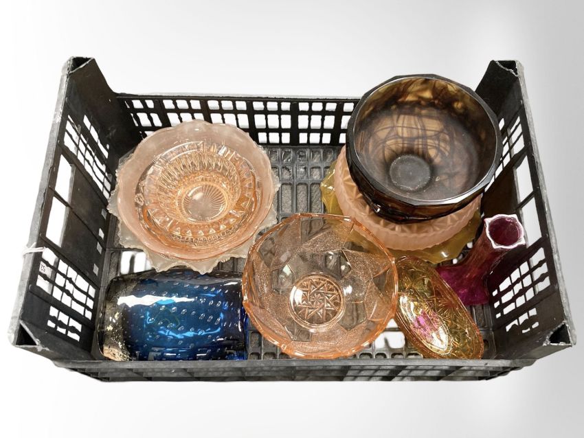 A group of antique and later coloured glass including Sowerby pink glass fruit bowl and other examples.