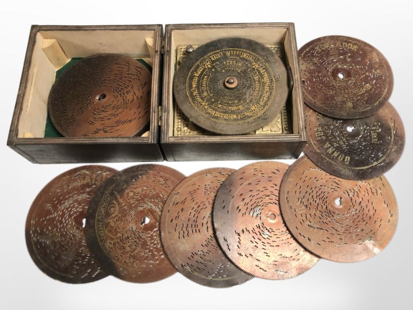An early-20th century disc music player, width 17cm.