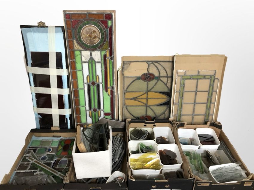 A group of early-20th century stained and leaded glass windows, together with four boxes containing assorted stained glass cuttings and fragments, strips of lead solder, and smaller stained glass windows, soldering iron, a guide to stained glass making, etc.