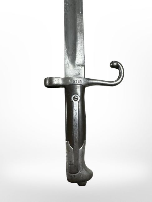 An Italian M 1870 Vetterli sword bayonet with brass-mounted leather scabbard, 51cm blade stamped' Torino', scabbard stamped 'Torino 1886'.