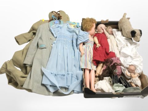 A group of antique and later dolls, including an Armand Marseile doll, stamped 390A2M to back of head, another german porcelain headed doll, stamped 390A3/0M, assorted dolls, sheepskin coat and Victorian clothing, a 20th century mohair figure of a dog, etc. (2 boxes)