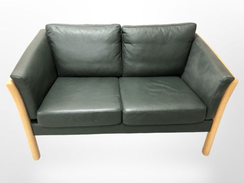 A late 20th century Danish dark green stitched leather wooden framed two seater settee, 140 cm x 87 cm x 80 cm