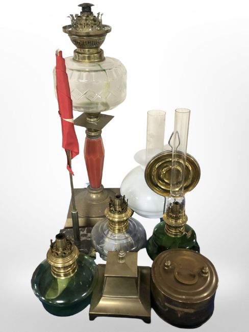 A brass oil lamp with clear glass reservoir and opaque shade, three further lamps, a Danish desk flagpole, brass inkwell, and a tin.