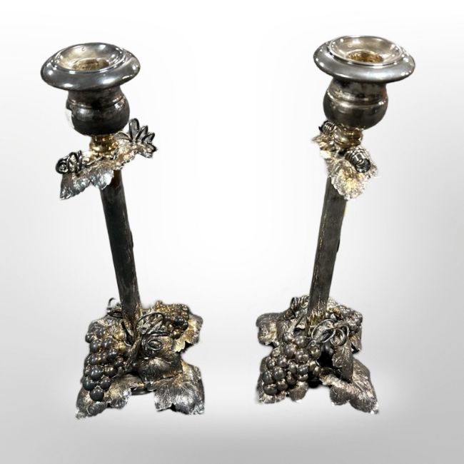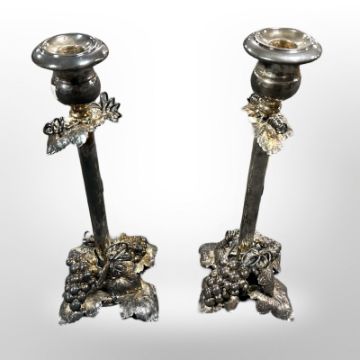 An ornate pair of silver plated grape and vine pattern candlesticks, height 32 cm