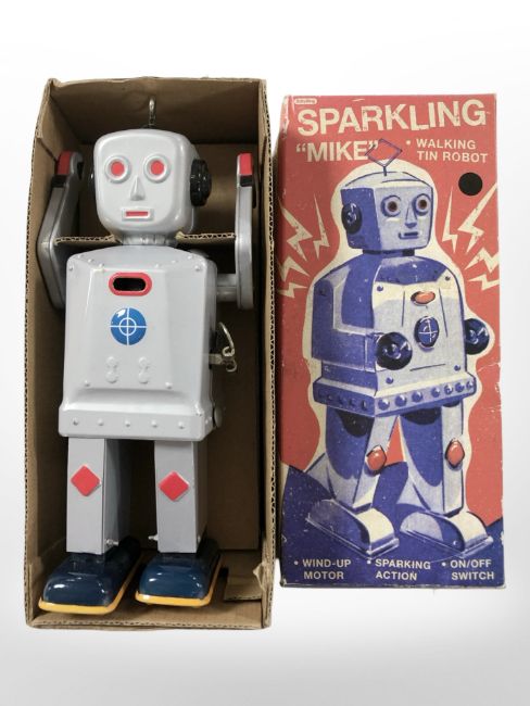 A Schylling Sparkling Mike walking tin robot roy, in original box.
