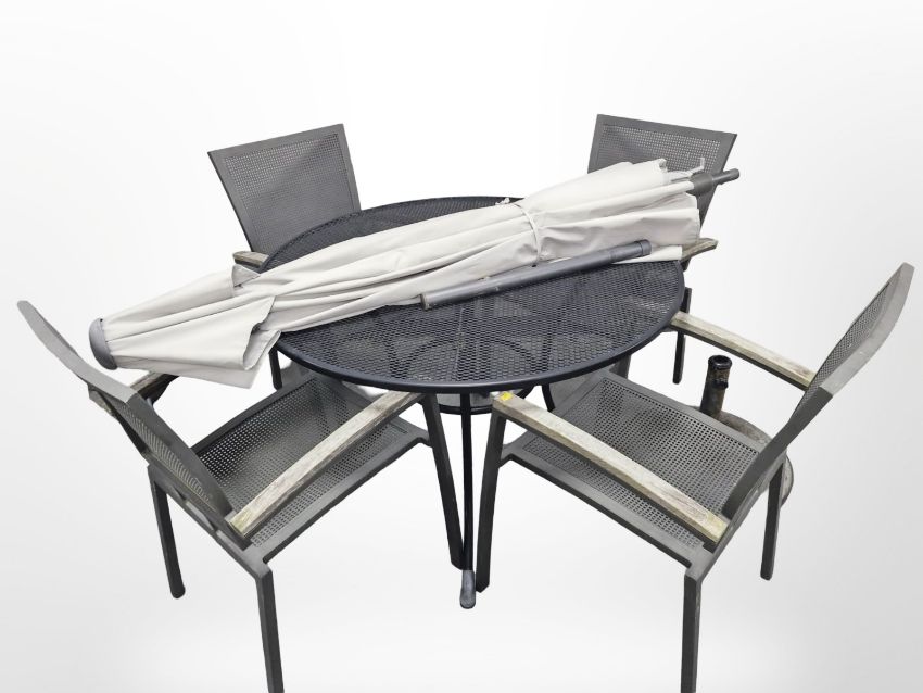 A circular metal garden table, diameter 110 cm, with parasol and set of four chairs with teak armrests