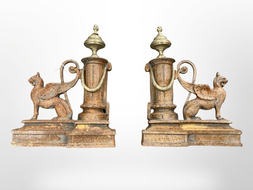 A pair of Victorian cast iron brass mounted fire dogs.