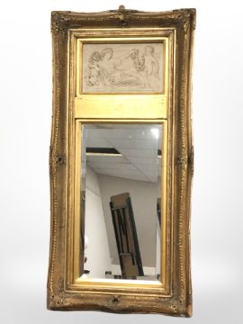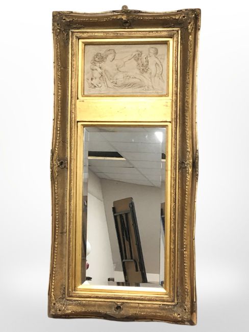 A reproduction gilt mirror with inset plaster panels depicting a classical scene, 115 cm x 56 cm