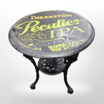 A Britannia style cast iron pub table with Theakston Peculier IPA top, height 70 cm