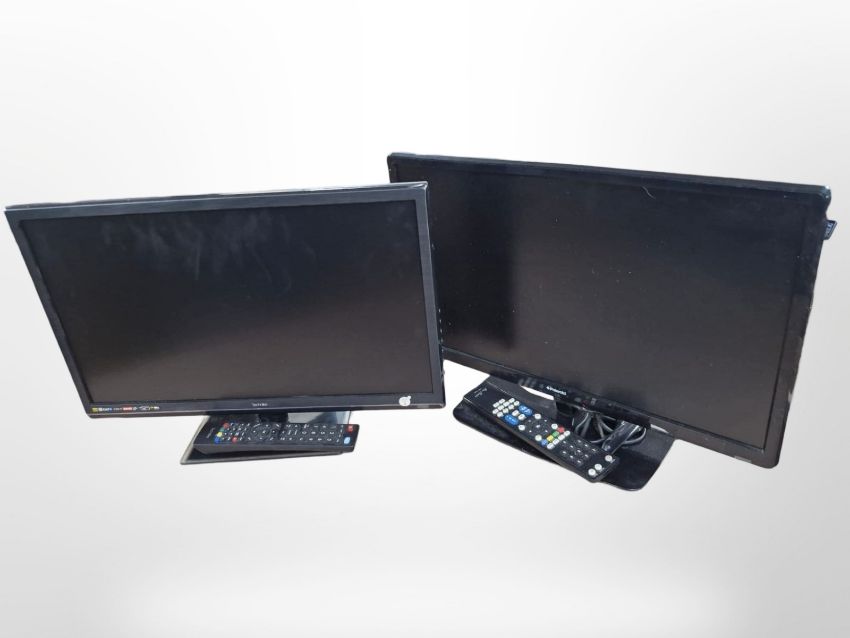 A Polaroid 22" LED TV and a Technika TV, with leads and remotes.