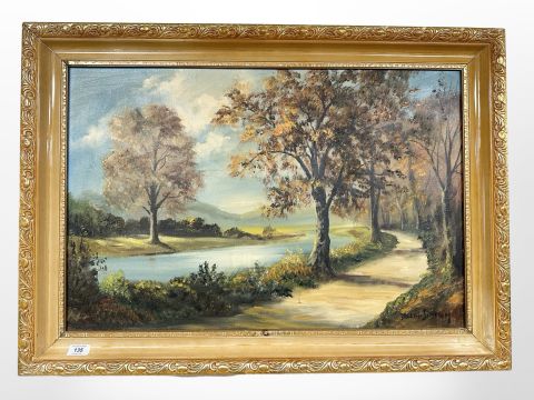 Dallas Simpson : A pathway by a river, oil on canvas, 75cm x 49cm.