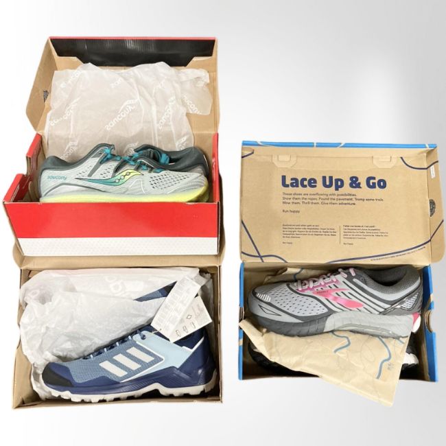 Three pairs of new shoes - Brooks, women's size 8.5, Adidas Terrex, women's size 8 and Saucony, size 6.