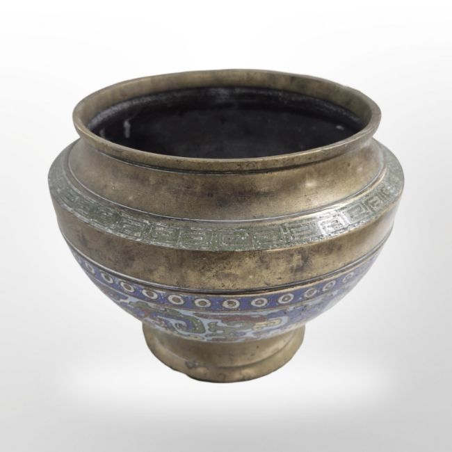 A Chinese brass and champleve enamel planter, height 16.5cm.