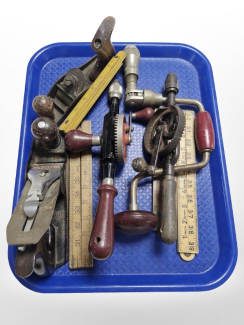 A Stanley Bailey no.4 wood working plane, further No.2 plane, two hand drills, carpenter's brace and group of folding wooden rules