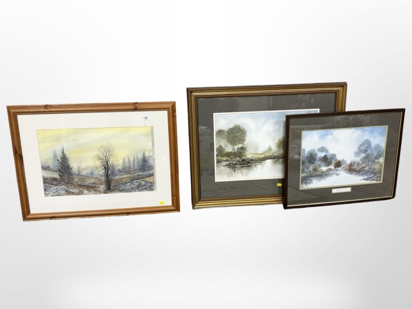 Pam Vardy : Valley landscape, watercolour, 54cm x 33cm, together with a watercolour and a colour print by Anthony Waller. (3)