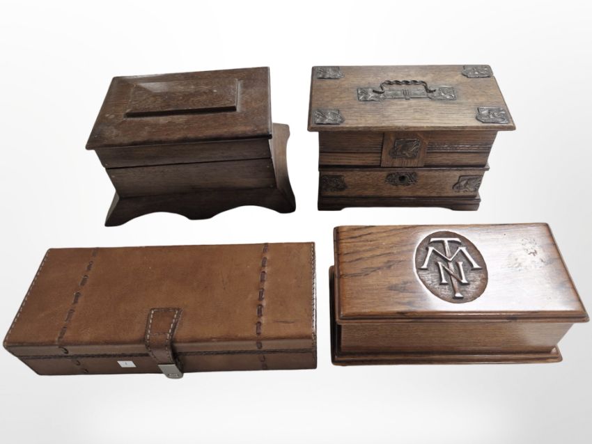 Two oak trinket boxes, a mahogany box and a leather box, largest 24cm wide.