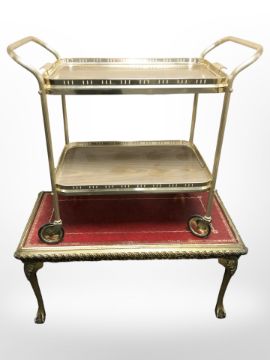A modern gilt and leather inset coffee table, width 95 cm and a two tier trolley