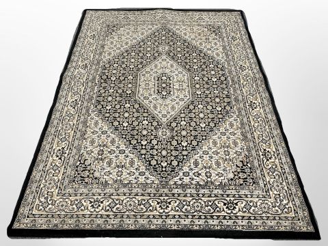 A Tabriz carpet, Iranian Azerbaijan, the black central Herati field with cream pole medallion, enclosed by a cream meandering vine border and black guard stripes, 227 cm by 170cm