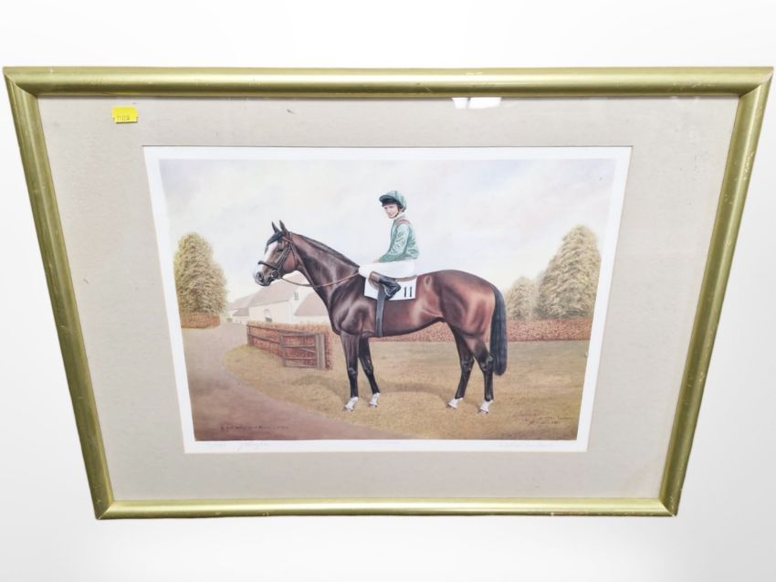 After G E Bingham : Shergar with Walter Swinburn, limited edition colour print, numbered 71 of 750, signed by the artist and Swinburn, 34 cm x 46 cm