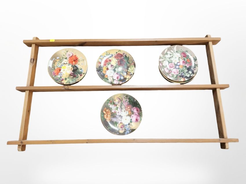 A pine plate rack, width 104 cm, and eleven Wedgwood floral collector's plates.