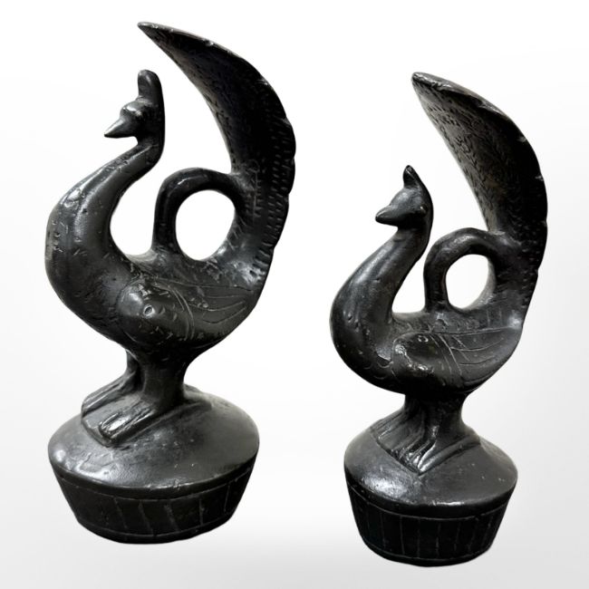 Two 19th century Chinese bronze opium weights modelled as peacocks, tallest 13.5cm