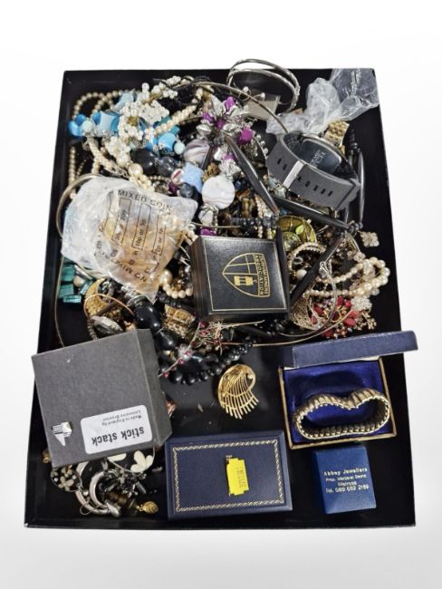 An assortment of costume jewellery, silver dress ring, wrist watch, simulated pearls etc
